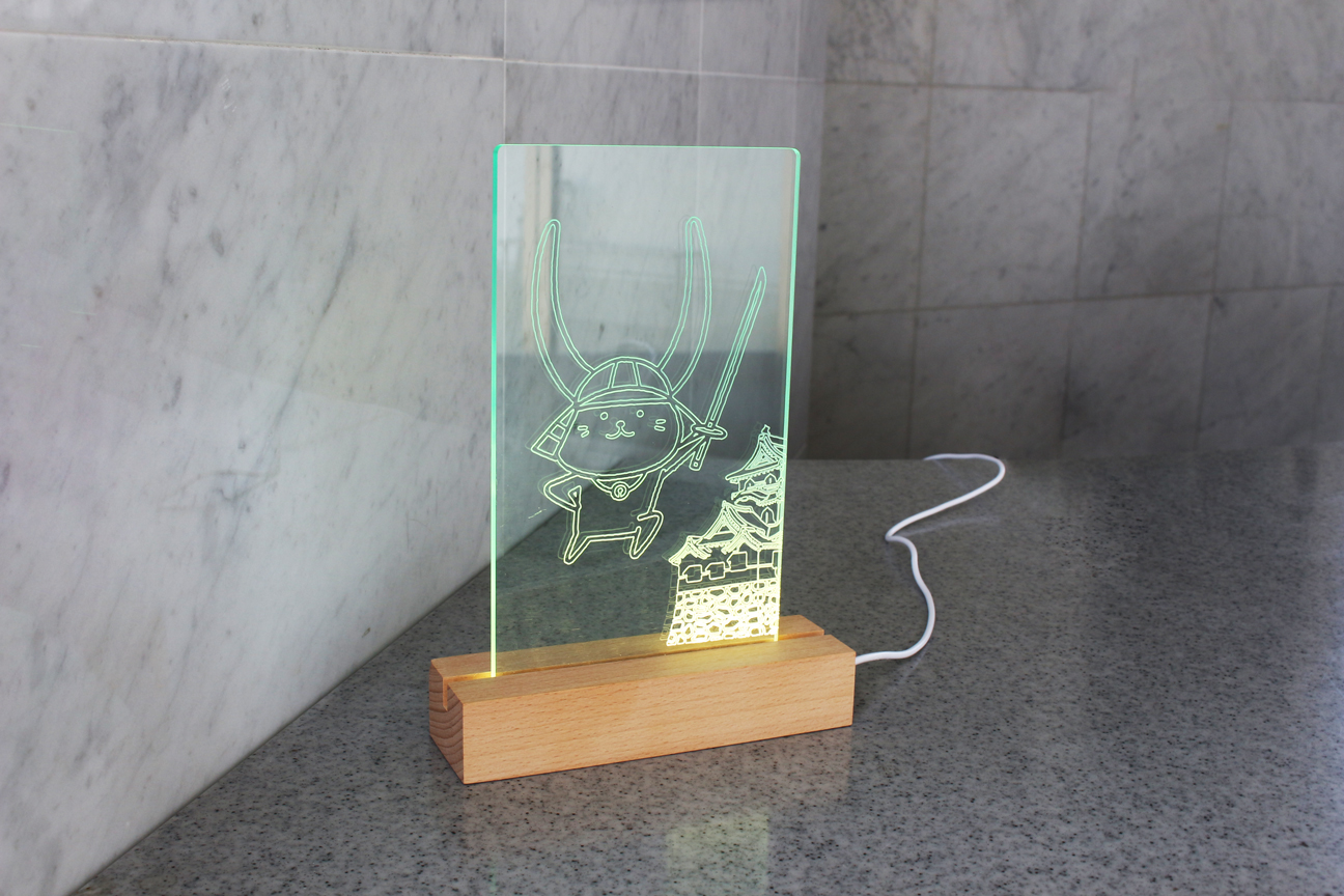 このLEDスタンドを作るにあたり一見すると本物のガラスではないかと見間違えするガラス色アクリル板を使用して、当社のプラスチック加工技術を駆使し、「ひこにゃん」が大好きな彦根城と勇ましい姿をした「ひこにゃん」を一緒に彫刻して描きました。付属のLEDライトを点灯すれば、彦根城の前で刀を持った勇ましいポーズ姿の「ひこにゃん」が浮かび上がります。また、特徴的な花頭窓(かとうまど)を描いておりますので、一目見ただけで国宝の彦根城と分かっていただけると思います。