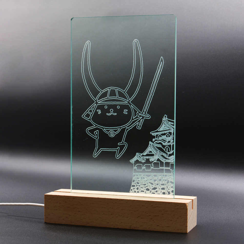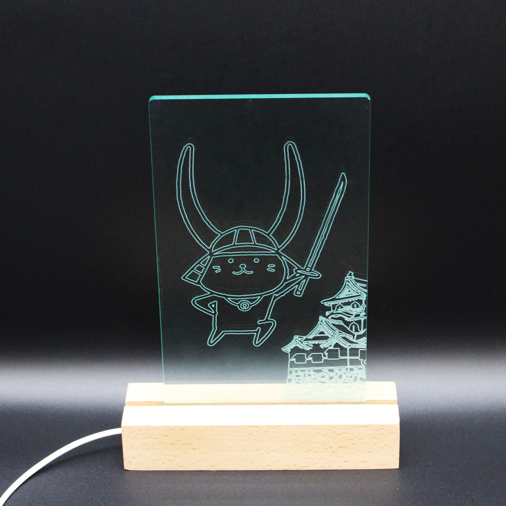 付属のLEDスタンドにセットしていただき下から光を当てると、彫刻にて描かれた、〝ここ滋賀限定図柄″の「ひこにゃん」と彦根城が輝きます。