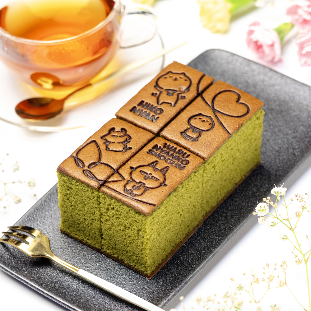 『しあわせのひこにゃんカステラ』のプレーンは彦根人気の『ひこにゃん』を、朝宮抹茶は『ひこにゃん』と『悪にゃんこ将軍』の焼印を押し、それぞれ4つに切り分け食べやすくしました。