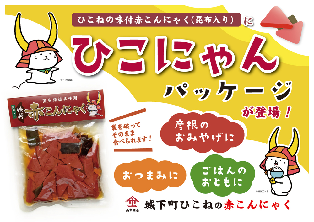 ひこね発信の味付赤こんにゃくをひこにゃんパッケージでお届けします。どうぞご賞味ください。